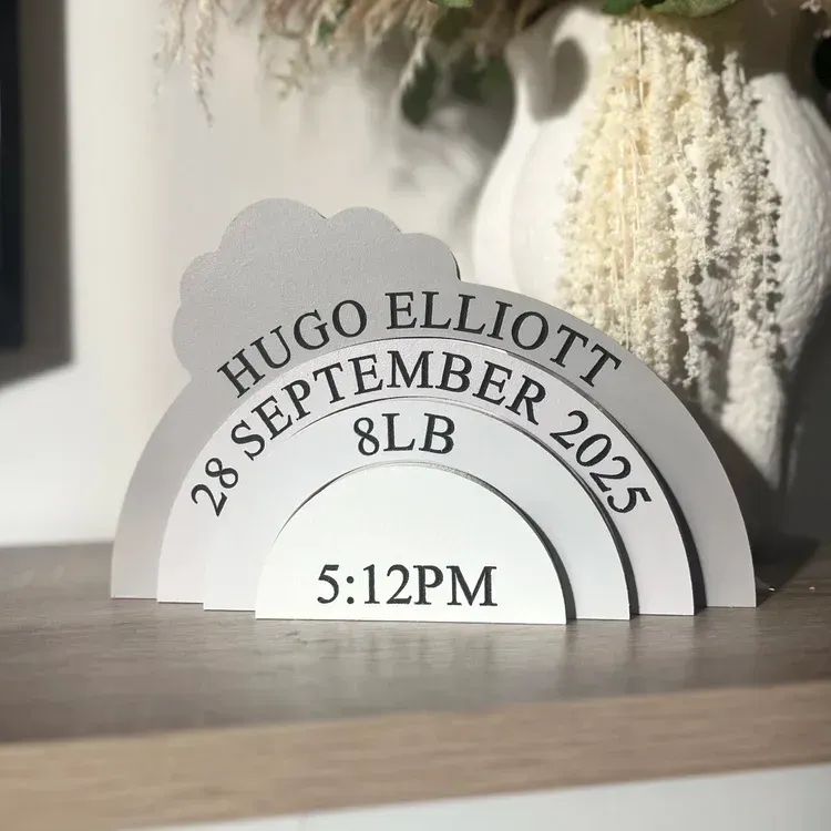 Geben Sie die relevanten Details (Name, Geburtsdatum, Uhrzeit, Gewicht) auf der Produkts eite ein, und wir werden ein individuelles Stück herstellen, das den besonderen Tag Ihres Babys perfekt darstellt.