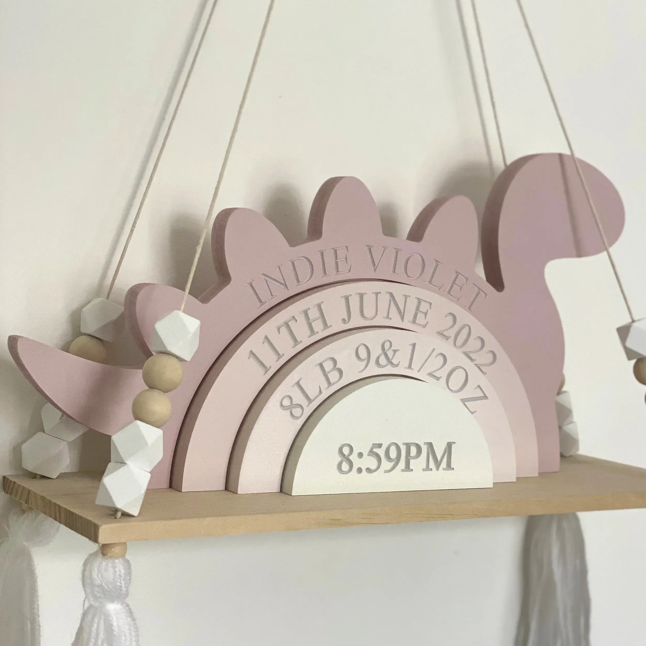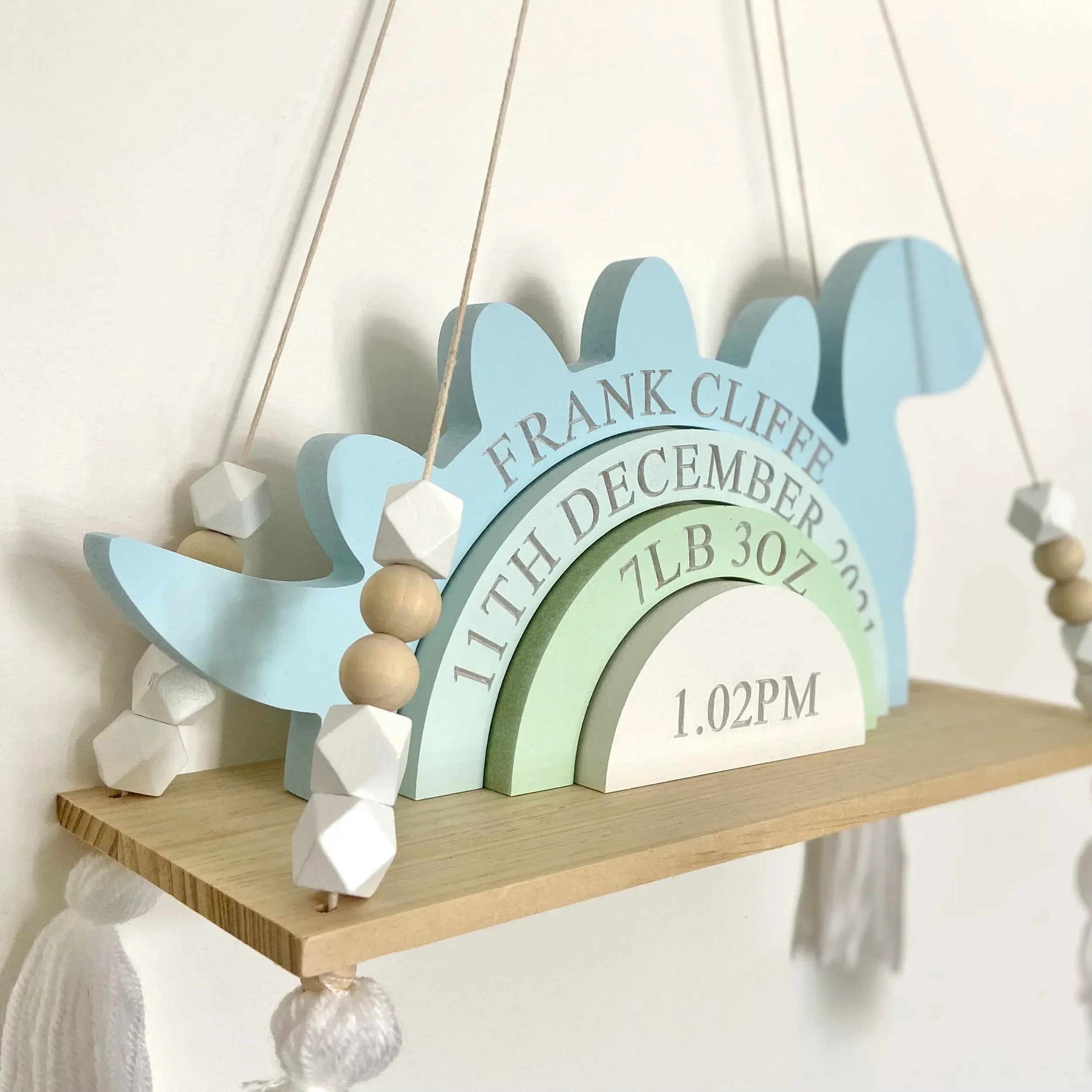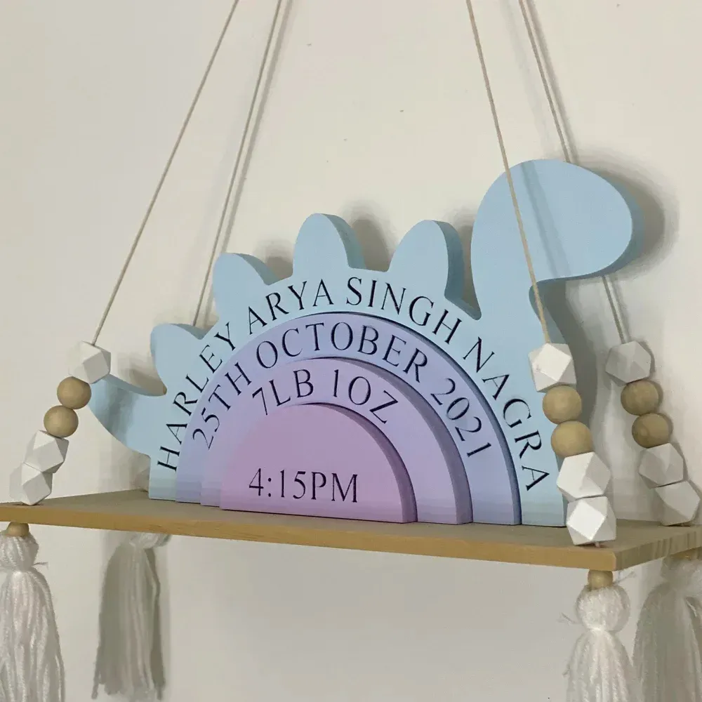 Dieses personal isierte Dinosaurier-Stacking-Spielzeug ist ein einzigartiges Andenken, das entworfen wurde, um die Geburt Ihres Babys zu feiern. Anpassbar mit dem Namen, dem Geburtsdatum, der Geburts zeit und dem Gewicht Ihres Babys, dient es als unvergessliches und bedeutungs volles Stück zum Gedenken an den besonderen Tag. Dieses Spielzeug aus hochwertigem Holz ist eine schöne und zeitlose Ergänzung des Kindergartens Ihres Babys.