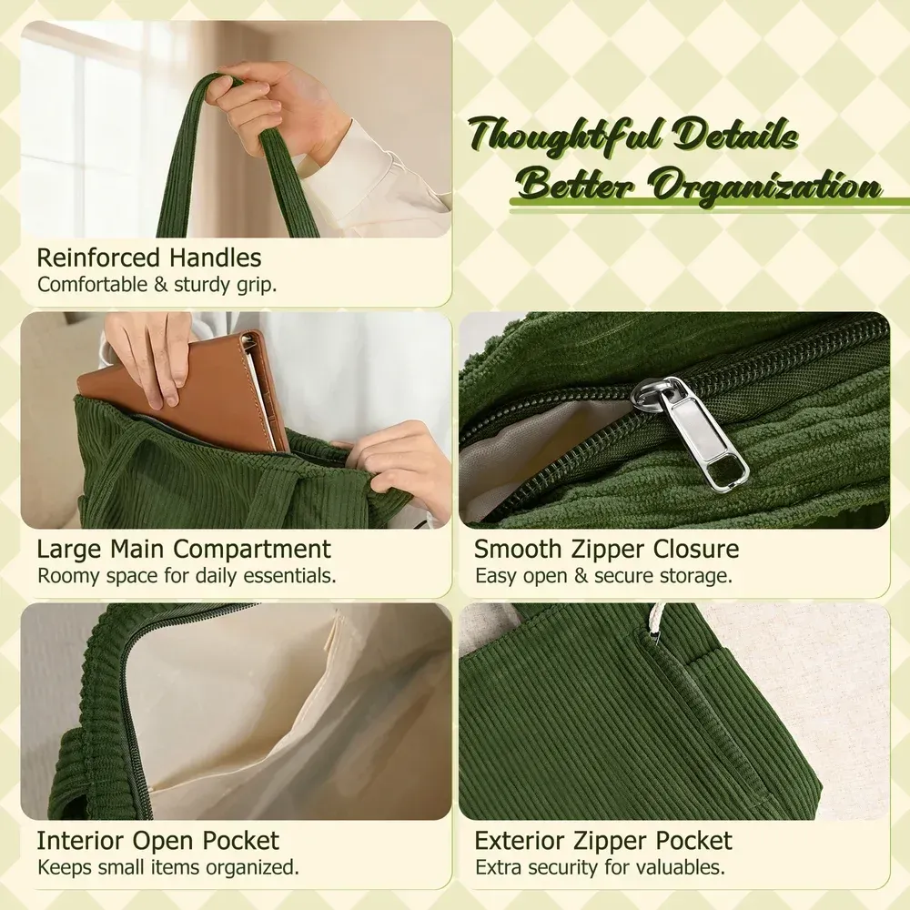 Hochwertiges Cord gewebe bietet ein weiches, substanzi elles Gefühl mit ausgeprägten, strukturierten Linien. Haltbar und belastbar, widersteht es Pilling und Verformung während des täglichen Gebrauchs. Geeignet für alle Jahreszeiten, schafft es eine Balance zwischen Komfort und Langlebig keit. Breite Schulter gurte reduzieren den Druck, sorgen für eine bequeme Passform, ohne sich einzu graben, und kombinieren gleichzeitig Praktikabilität mit ergonomischem Design.