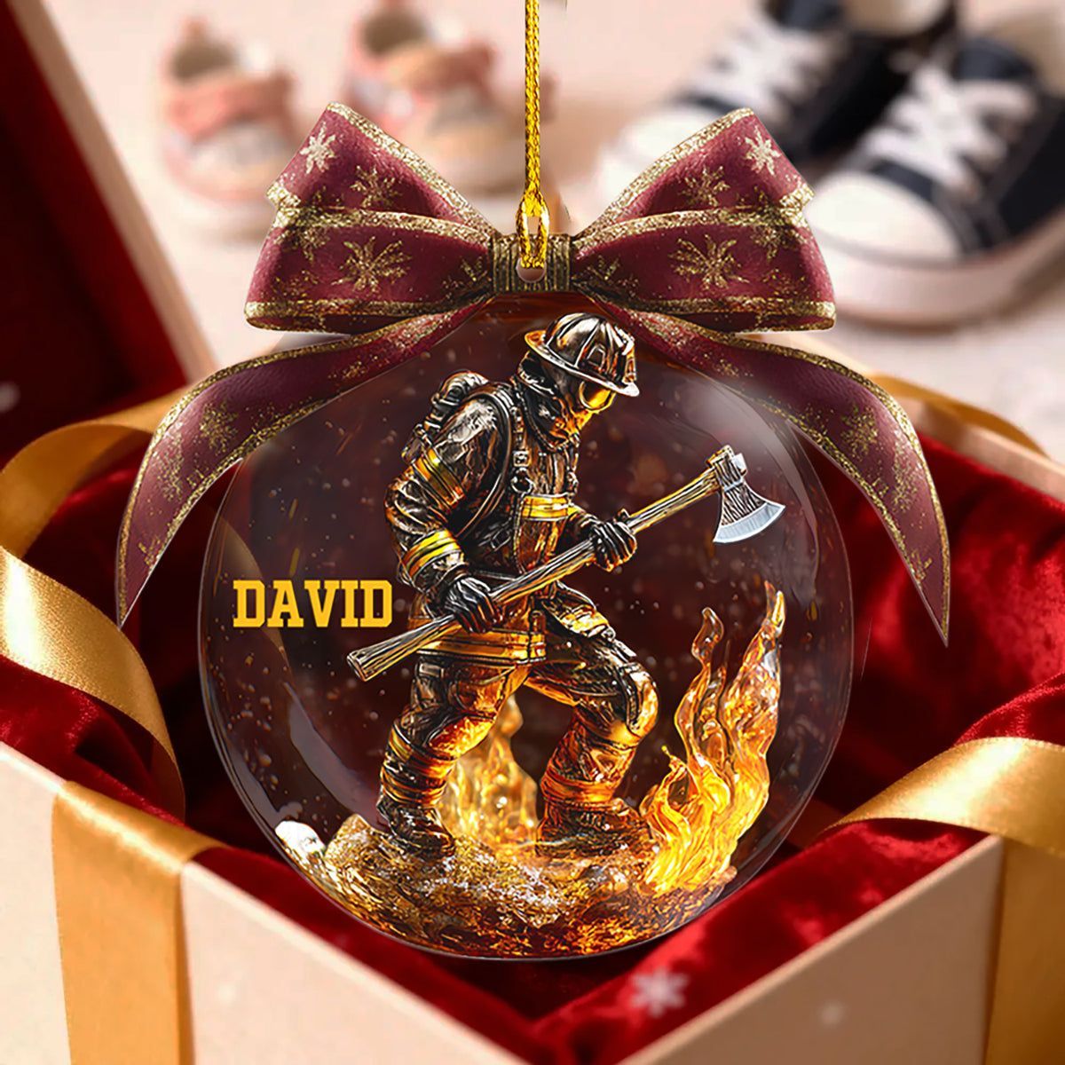 Ehren Sie den Mut, die Hingabe und den Geist eines wahren Helden mit diesem Feuerwehrmann-Ornament mit individuellem Namen. Es zeigt ein detailliertes 3D-Design, das einen voll bewaffneten Feuerwehrmann zeigt, der tapfer mit einer Axt inmitten eines Feuers steht. Dieses Ornament ehrt diejenigen, die beschützen und dienen. Personalisieren Sie es mit einem Namen und schaffen Sie ein Andenken, das so einzigartig ist wie der Held, den es repräsentiert. Perfekt zum Aufhängen an Ihrem Weihnachtsbaum oder als Geschenk für einen Feuerwehrmann oder ein stolzes Familienmitglied – ein Weihnachtsschatz, der Stolz und Wertschätzung ausstrahlt.