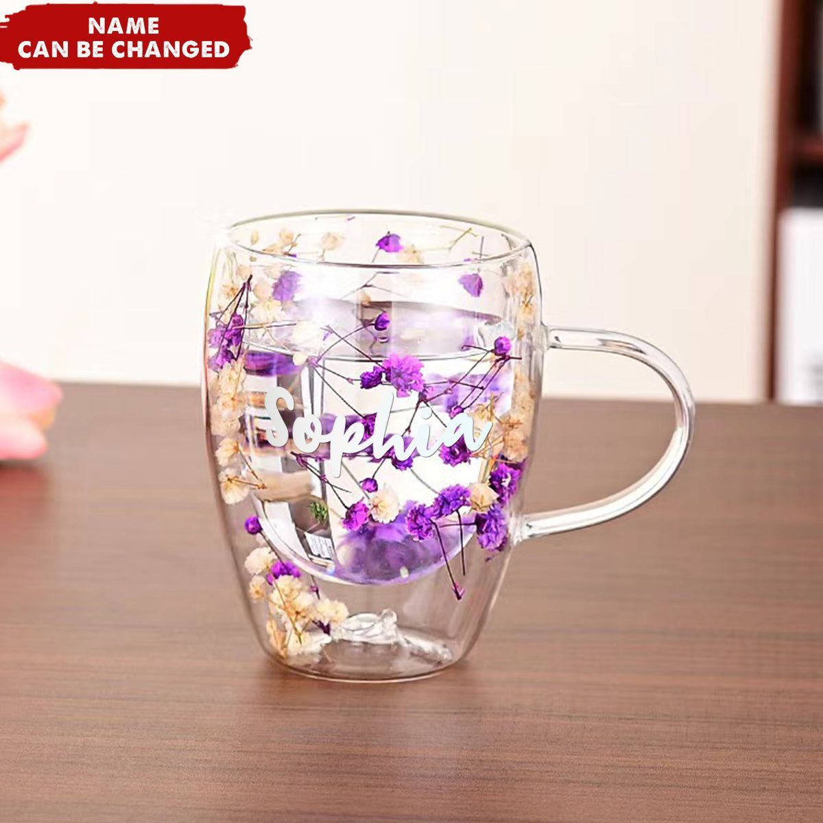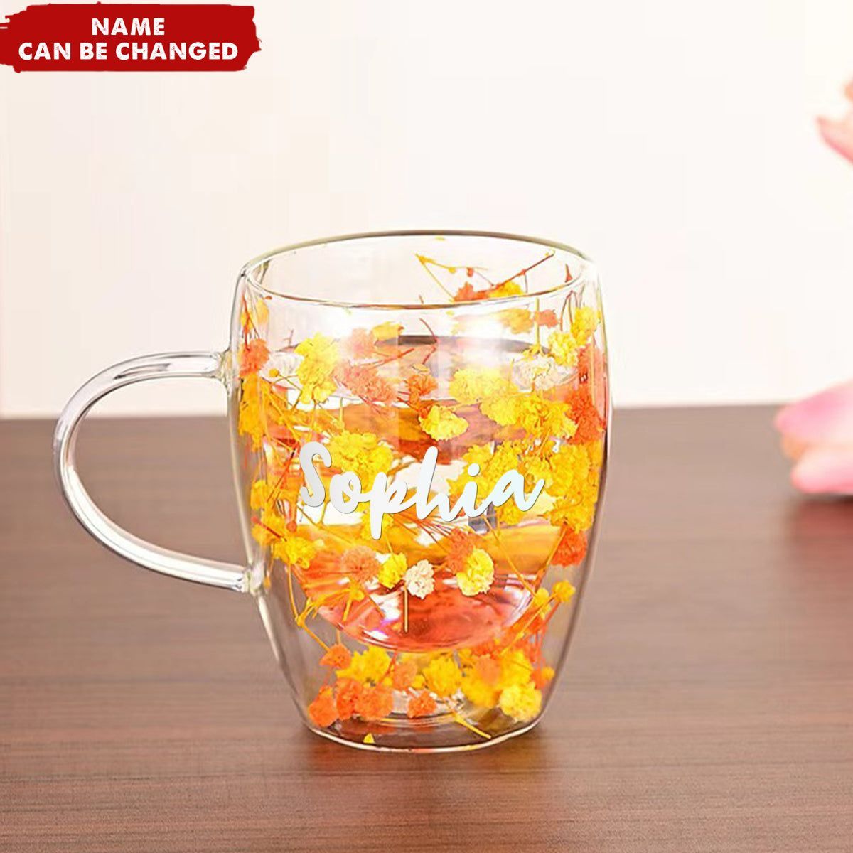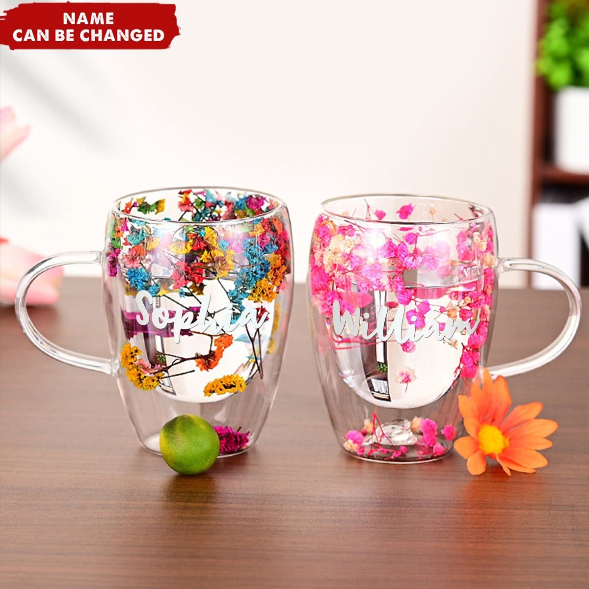 Doppelwandige Kaffeetassen aus Glas mit getrockneten Blumen