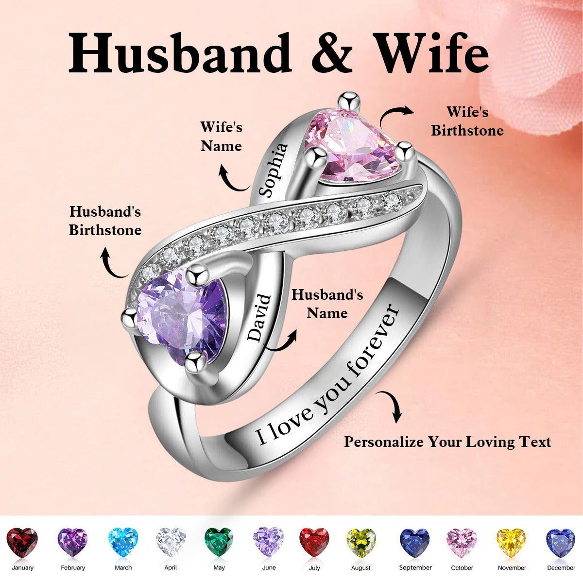 1 x personalisierter Infinity-Verlobungsring mit Geburtsstein und Namen für Paare