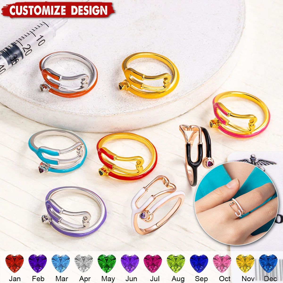 Personalisierter herzförmiger Geburtssteinring – verstellbar und individuell gestaltbar – ein aufmerksames Geschenk für Mitarbeiter im Gesundheitswesen.