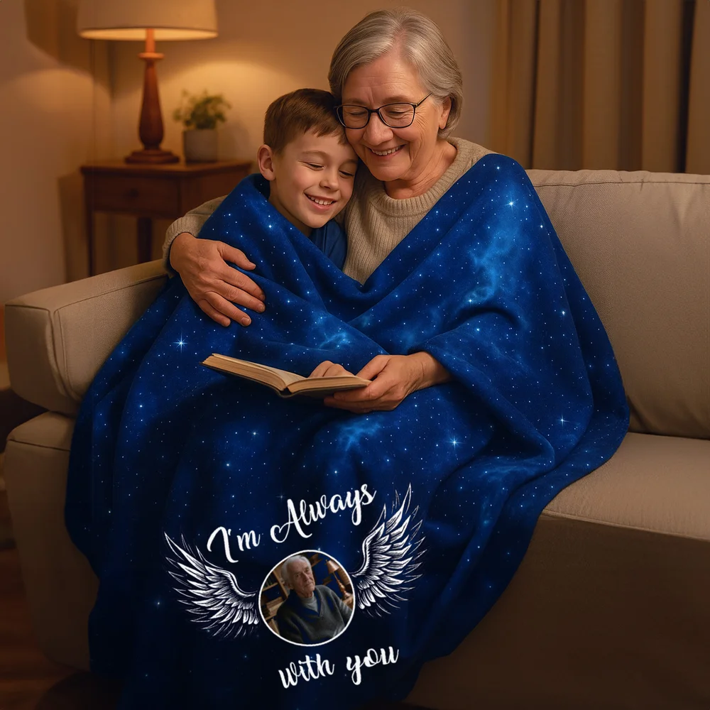 Personalisierte, weiche Kuscheldecke mit Sternenhimmel-Engelsflügel-Foto und dem Text In liebevoller Erinnerung – ein tröstliches Geschenk zum Verlust eines geliebten Menschen.